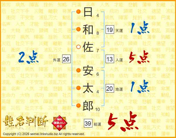日(4画)和(8画)佐(7画) 安(6画)太(4画)郎(10画)