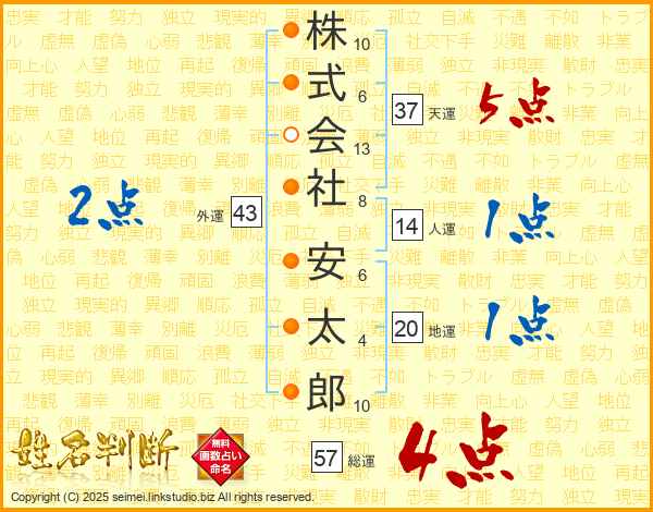 株(10画)式(6画)会(13画)社(8画) 安(6画)太(4画)郎(10画)