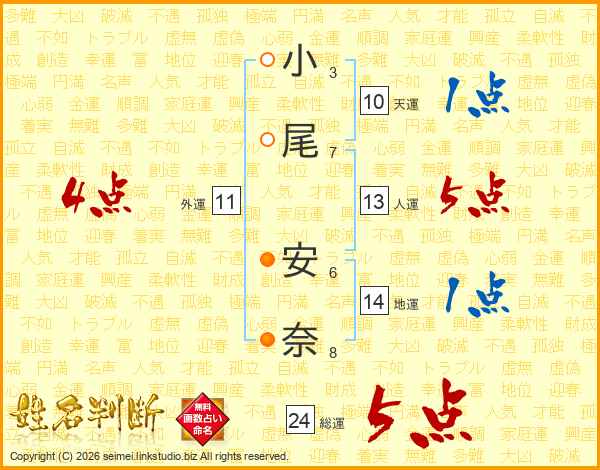 小尾安奈さんの総運は24画の5点!