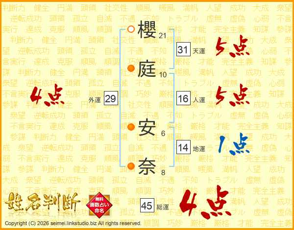 櫻庭安奈さんの総運は45画の4点!