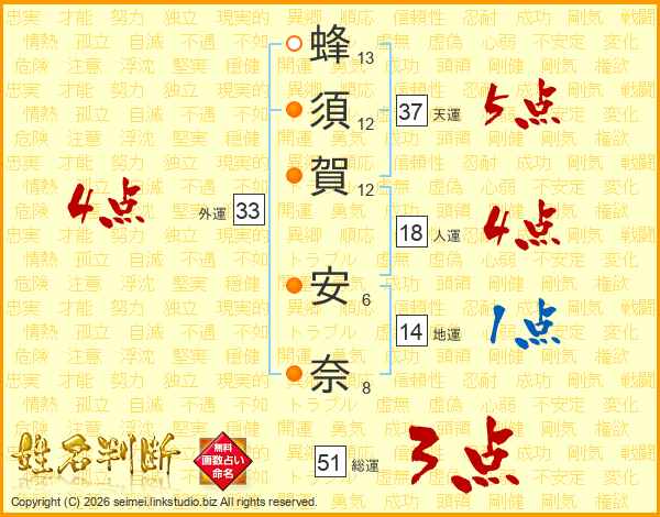 蜂(13画)須(12画)賀(12画) 安(6画)奈(8画)