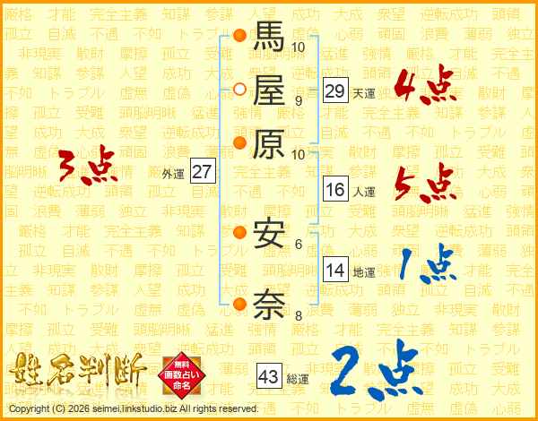 馬(10画)屋(9画)原(10画) 安(6画)奈(8画)