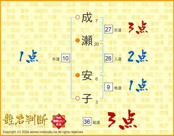成(7画)瀬(20画) 安(6画)子(3画)