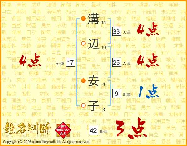 生活面を象徴する運勢です。外部から受ける影響力を表し、結婚運、家庭運や職場、環境への順応性を表します。総運から人運を引いた画数。姓や名が1文字の場合を除く。
