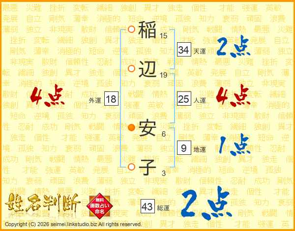 生活面を象徴する運勢です。外部から受ける影響力を表し、結婚運、家庭運や職場、環境への順応性を表します。総運から人運を引いた画数。姓や名が1文字の場合を除く。