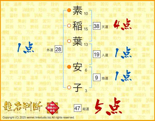 素(10画)稲(15画)葉(13画) 安(6画)子(3画)