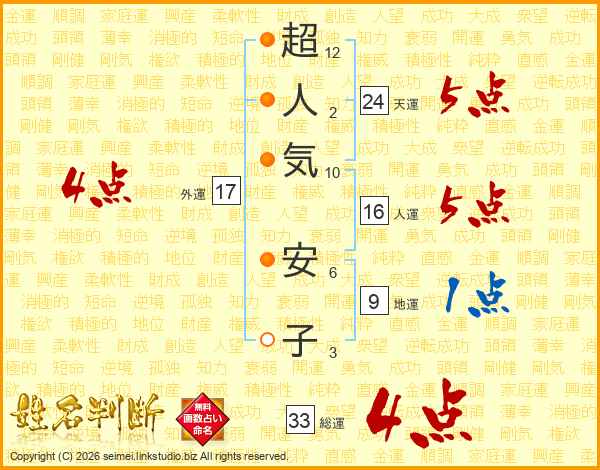 超(12画)人(2画)気(10画) 安(6画)子(3画)