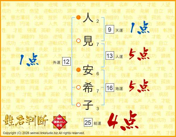 人(2画)見(7画) 安(6画)希(7画)子(3画)