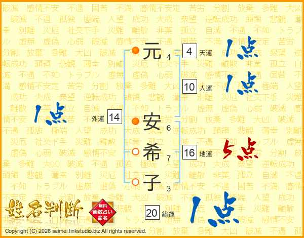 元(4画) 安(6画)希(7画)子(3画)