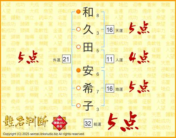 和(8画)久(3画)田(5画) 安(6画)希(7画)子(3画)