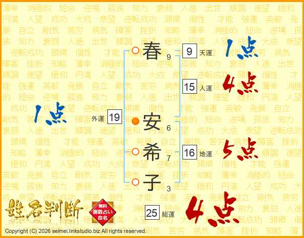 あなたの人生を表す1番重要な運勢です。生涯を通じて影響する総合運となり、主に50歳以降の晩年期に影響を及ぼします。苗字と名前の合計画数。