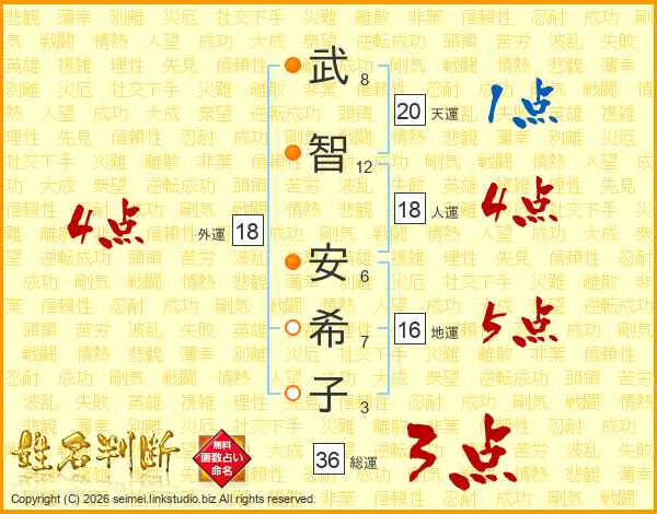 武(8画)智(12画) 安(6画)希(7画)子(3画)