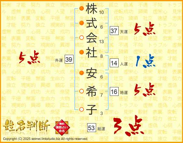 株(10画)式(6画)会(13画)社(8画) 安(6画)希(7画)子(3画)
