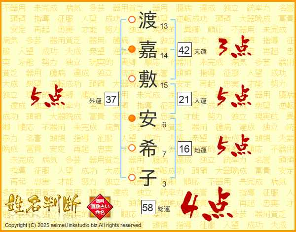 渡(13画)嘉(14画)敷(15画) 安(6画)希(7画)子(3画)