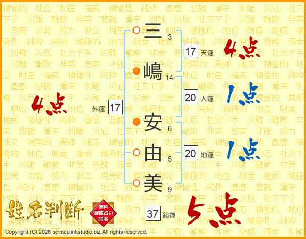 三(3画)嶋(14画) 安(6画)由(5画)美(9画)