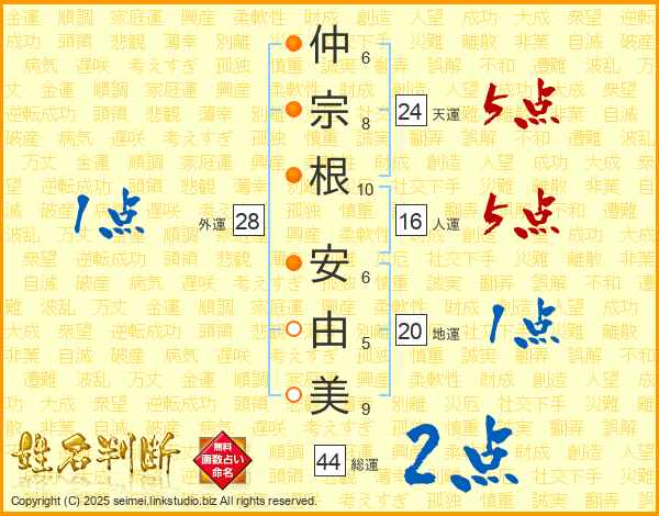 仲(6画)宗(8画)根(10画) 安(6画)由(5画)美(9画)