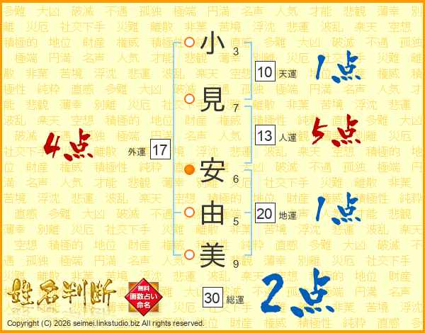 小(3画)見(7画) 安(6画)由(5画)美(9画)