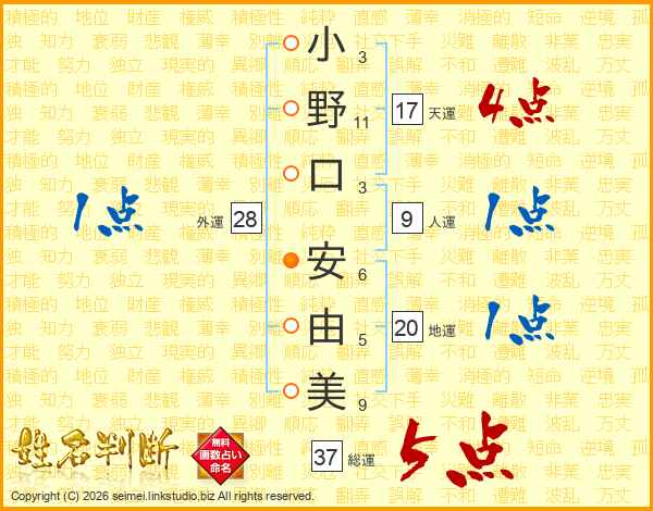 小(3画)野(11画)口(3画) 安(6画)由(5画)美(9画)