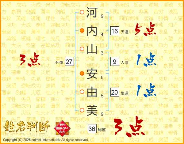 河(9画)内(4画)山(3画) 安(6画)由(5画)美(9画)
