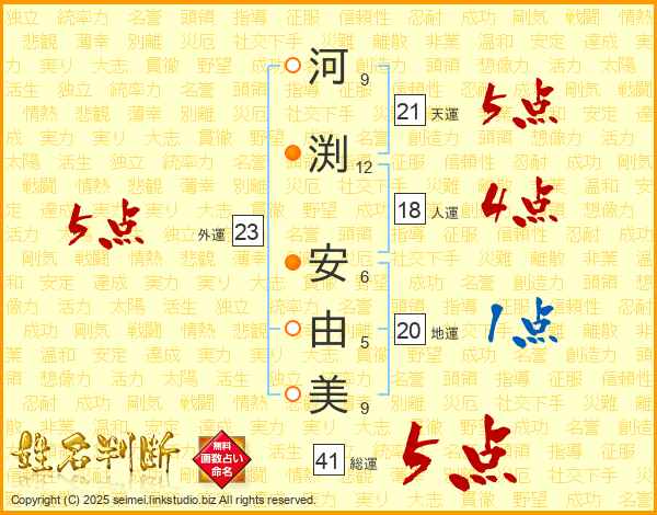 河(9画)渕(12画) 安(6画)由(5画)美(9画)
