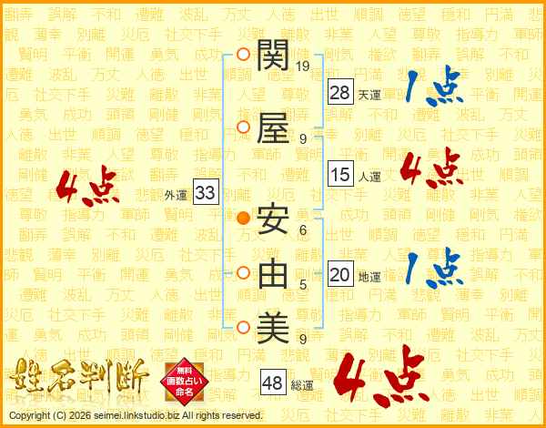 関(19画)屋(9画) 安(6画)由(5画)美(9画)