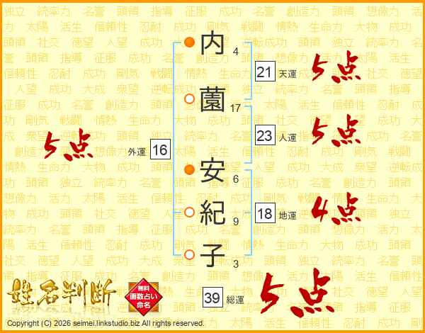 内(4画)薗(17画) 安(6画)紀(9画)子(3画)