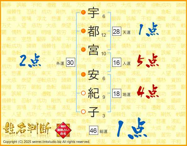 宇(6画)都(12画)宮(10画) 安(6画)紀(9画)子(3画)