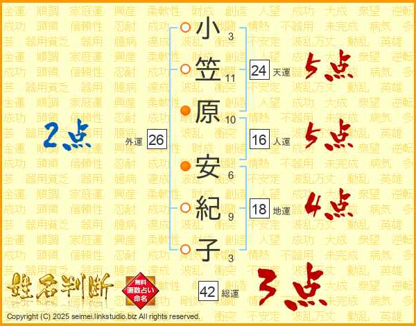 小(3画)笠(11画)原(10画) 安(6画)紀(9画)子(3画)