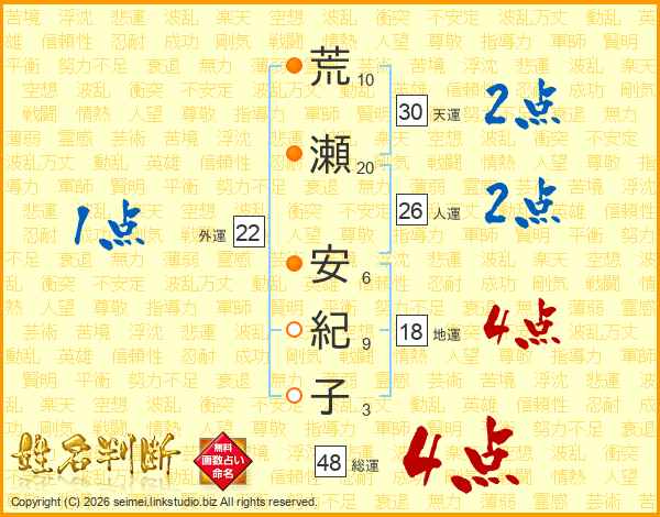 荒(10画)瀬(20画) 安(6画)紀(9画)子(3画)