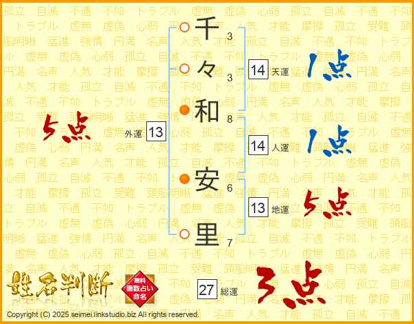 千(3画)々(3画)和(8画) 安(6画)里(7画)