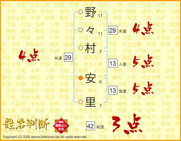 野(11画)々(11画)村(7画) 安(6画)里(7画)