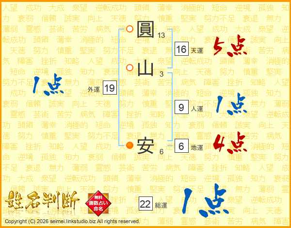 生活面を象徴する運勢です。外部から受ける影響力を表し、結婚運、家庭運や職場、環境への順応性を表します。総運から人運を引いた画数。姓や名が1文字の場合を除く。