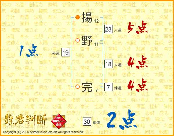 揚野完さんの天運は23画の5点!