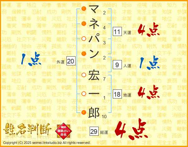 マ(2画)ネ(4画)パ(3画)ン(2画) 宏(7画)一(1画)郎(10画)
