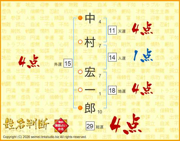 中(4画)村(7画) 宏(7画)一(1画)郎(10画)