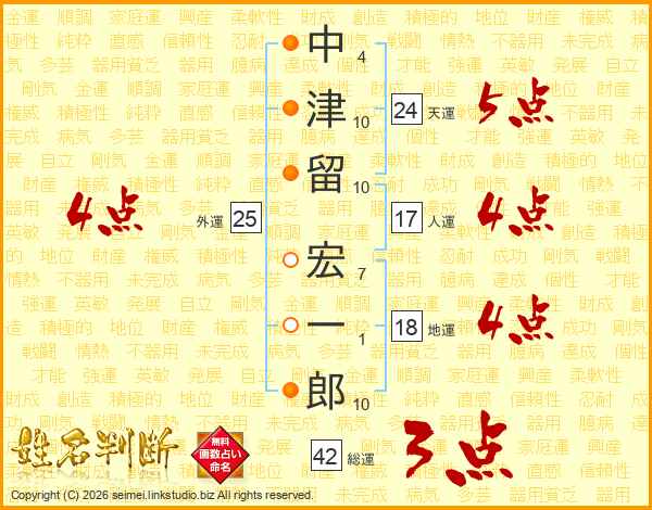 中(4画)津(10画)留(10画) 宏(7画)一(1画)郎(10画)