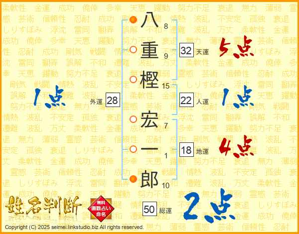 八(8画)重(9画)樫(15画) 宏(7画)一(1画)郎(10画)