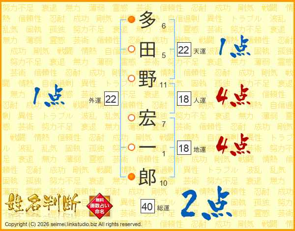 多(6画)田(5画)野(11画) 宏(7画)一(1画)郎(10画)