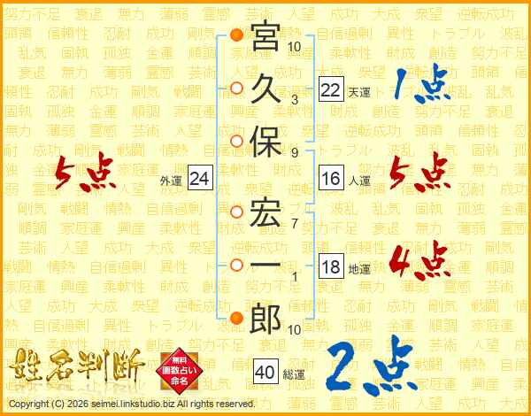 宮(10画)久(3画)保(9画) 宏(7画)一(1画)郎(10画)