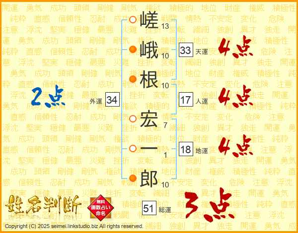 嵯(13画)峨(10画)根(10画) 宏(7画)一(1画)郎(10画)