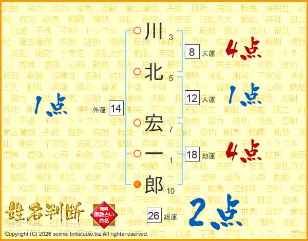 川(3画)北(5画) 宏(7画)一(1画)郎(10画)
