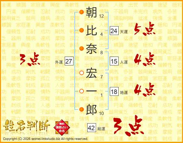 朝(12画)比(4画)奈(8画) 宏(7画)一(1画)郎(10画)