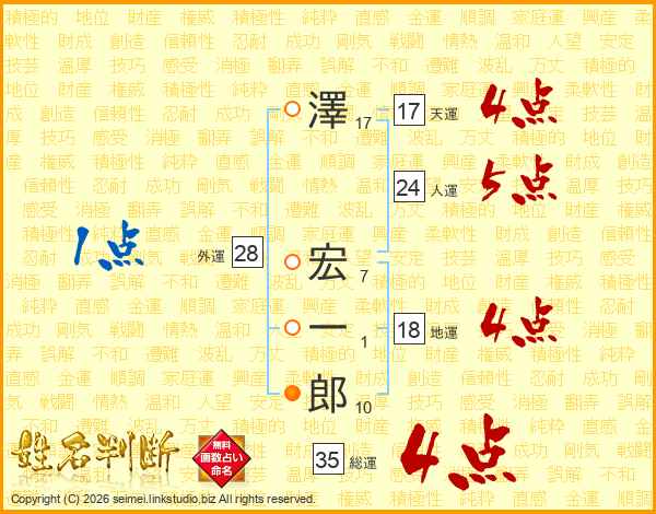 澤(17画) 宏(7画)一(1画)郎(10画)