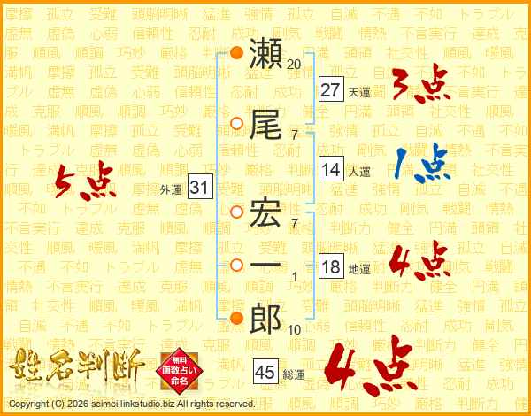 瀬尾宏一郎さんの総運は45画の4点!