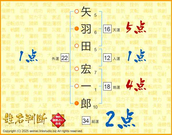 矢(5画)羽(6画)田(5画) 宏(7画)一(1画)郎(10画)