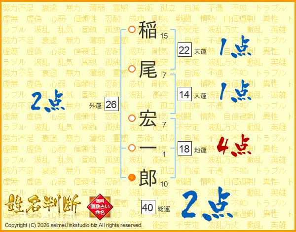 稲(15画)尾(7画) 宏(7画)一(1画)郎(10画)