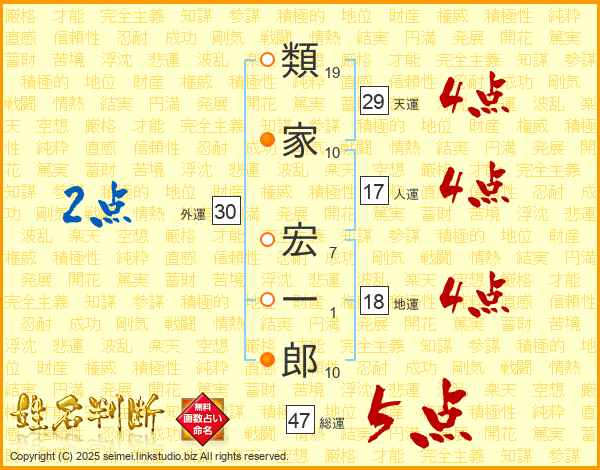 類(19画)家(10画) 宏(7画)一(1画)郎(10画)