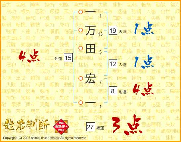 一(1画)万(13画)田(5画) 宏(7画)一(1画)