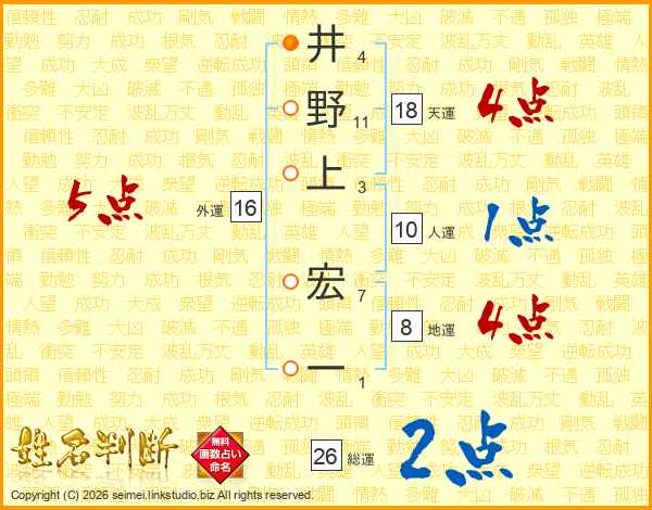 井(4画)野(11画)上(3画) 宏(7画)一(1画)