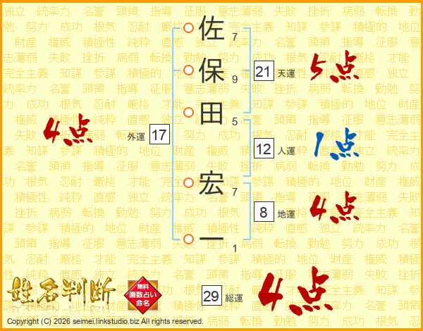 佐(7画)保(9画)田(5画) 宏(7画)一(1画)